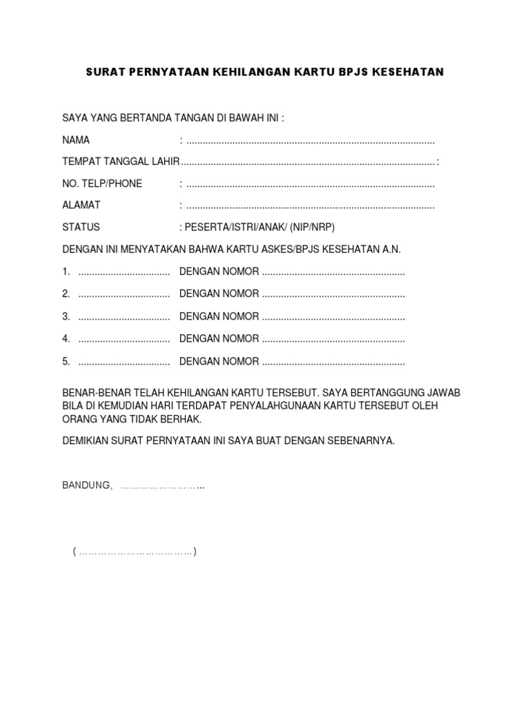 Surat Pernyataan Kehilangan Kartu Bpjs - Contoh Surat Pernyataan Tanda Terima Hilang Contoh Surat : Jun 20, 2019 · surat kehilangan dari kepolisian (opsional), bisa menggunakan surat kehilangan dari kepolisian atau cukup dengan surat pernyataan kehilangan bermaterai 6.000.
